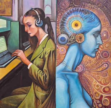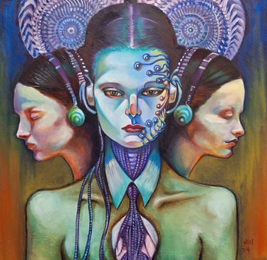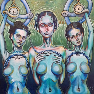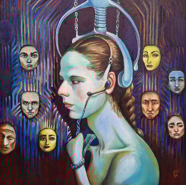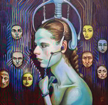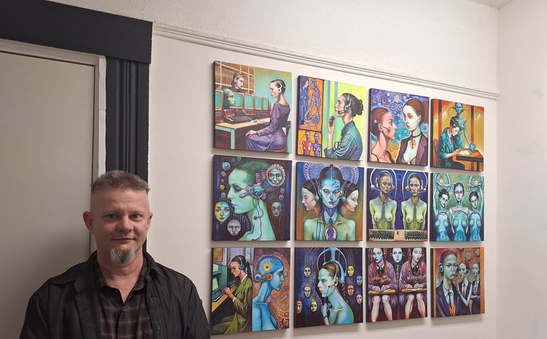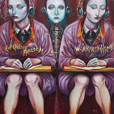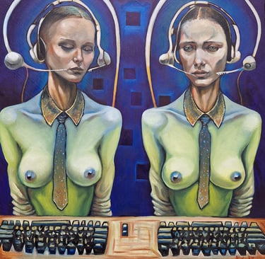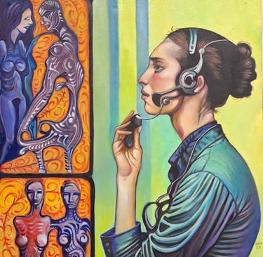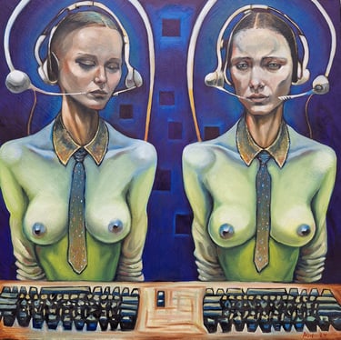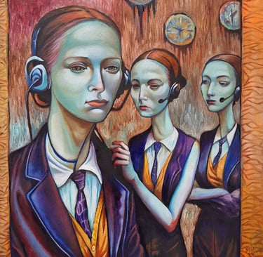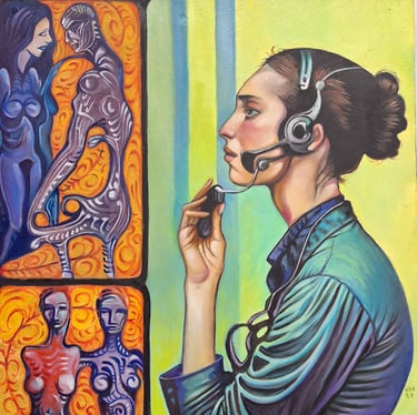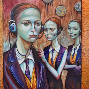 This is a series of 12 oil paintings I created in 2024. The series is about some experiences I had while working at a call center in which we provided captions for the hearing impaired. The series explores themes such as monotonous work, technology and alienation. Each painting is 12" x 12" oil on masonite.